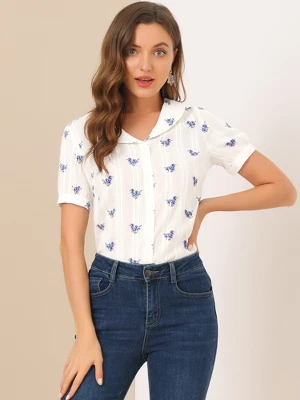 This chic short sleeve shirt is completed with a peter pan collar, button front, lace Insert, and cute floral, lending a youthful twist to your favorite career style.Soft, lightweight cotton fabric provides a comfy feeling. This lightweight cotton shirt is essential for your wardrobe.Style it with your favorite high-waist jeans or skirts, and show your charm. Add a little whimsy to your look with this cute and elegant floral print blouse.Designed with a V-neck for a regular fit that leaves room for a favorite necklace, this flower pattern top boasts short sleeves that end in button cuffs above your wrist for a polished look.Perfect for daily wear, office, work, school, business events, travel, vacation, holidays, weekend brunch with friends or casual, etc.