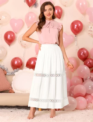 Keep Things Sophisticated in A Feminine Look on This Hollow Out Lace White Maxi Skirt. Endless versatility and unfettered comfort make this feminine skirt nice to wear. Whether twirling across the dance floor or sitting for a length of time, the graceful skirt keeps simple and comfortable. Blanketed in pure color and styled with a comfy elastic waist, this sweeping maxi enlivens any day-to-night ensemble.