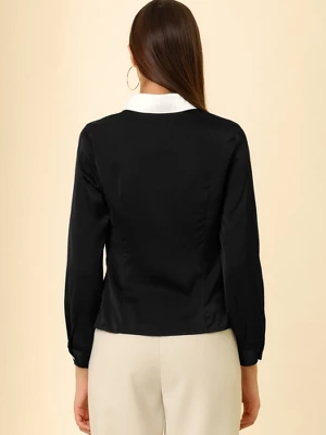 Crafted from lightweight fabric, these women’s button-front shirt pairs well with both casual or dressy bottoms for versatile looks. The design of the layered turn-down contrast collar shows a more elegant temperament. This satin shirt has a classic button-up front and long sleeves with button cuffs for easy wear. Style it with solid pants, high heels, and a handbag for an elegant look.