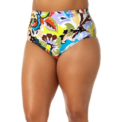 For stand out beach style, this plus size Fold Over High Waist Shirred Bikini Swim Bottoms is a must-have for your swimwear collection. The vibrant band adds a pop of color to these Anne Cole Plus swim bottoms, which will give you a flattering fit with its high waisted cut and shirred details. You can also flip up the band for extra coverage around your waist and hips. Pair with our Flounce V Neck Tunic Swimsuit Cover Up for a breezy look!