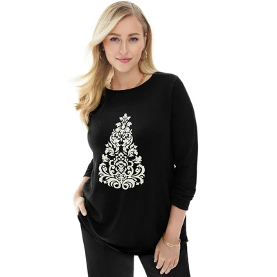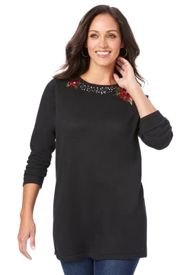 Soft scoop-neck sweater adds cozy holiday cheer to any outfit. 2″ side slits.