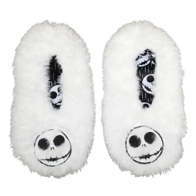 - CUSTOM DESIGN: Jack Skellington’s face appears on a white faux fur background on these slipper socks while the reverse side features all over print of Jack’s face on a black background. Nightmare Before Christmas fans will love this fun design.