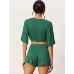 Cheibear Women’s V Neck Yoga Flare Sleeve Crop Shirt And Shorts 2 Pieces Pajama Set Loungewear