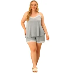 Agnes Orinda Pajamas Set For Women Plus Size Lace Panel Elastic Waist Shorts Sleepwear Loungewear