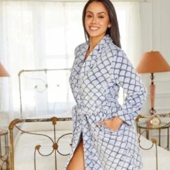 Women’s Warm Soft Plush Fleece Bathrobe, Knee Length Robe, Seashell Scalloped