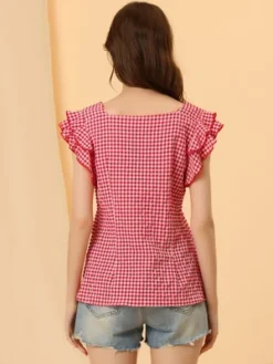 Allegra K Women’s Summer Gingham Square Neck Ruffle Sleeve Blouse
