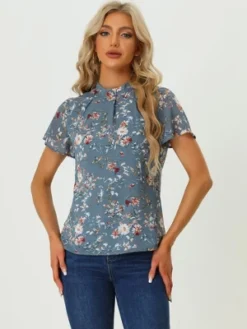 Allegra K Women’s Stand Collar Pleated Front Chiffon Floral Blouses