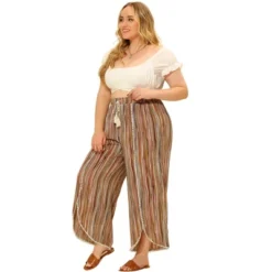 Agnes Orinda Women’s Plus Size Split Elastic Waist Flowy Striped Casual Wide Leg Fashion Pants