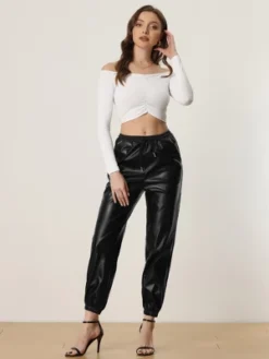 Allegra K Faux Leather Pants For Women’s Drawstring High Waist Joggers Casual Tapered Trousers