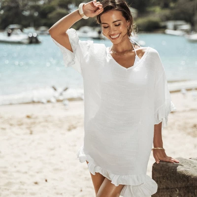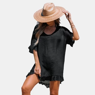 Flaunt your beachy vibes with this frilly mini cover-up dress featuring a V-neck and ruffled trim that’ll make all heads turn! Perfect for slipping over your favorite swimsuit, this dress features a flattering V-neckline, stylish drop sleeves, playful ruffled details and a mini hem that will keep you cool and comfortable all day long. So whether you’re lounging by the pool or taking a stroll along the shore, this cover-up dress has got you covered!Product code:CAA07B3B012CC/CAA07B3B012AA