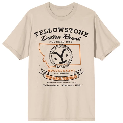 Defend the ranch with this Yellowstone tee. The shirt features an image of the series logo on the state of Montana while black and orange letters read, “Yellowstone, Dutton Ranch, Your Ranch, Your Rules.” The tee comes in a natural short sleeve crew neck. Fans of the Yellowstone TV series will love this comfy cotton t-shirt.